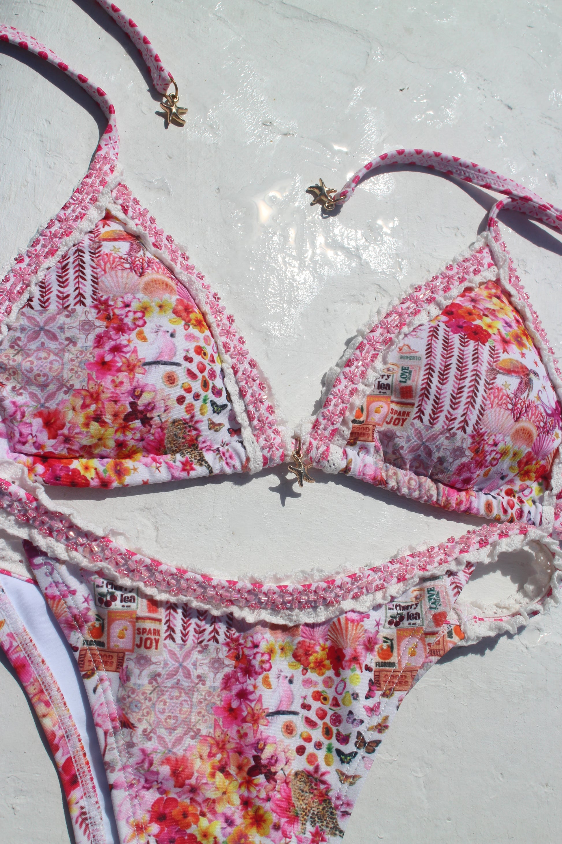 Romantic, bold, and made to glow. The Elara Top blends soft florals with layered prints and delicate details that elevate your whole swim look. Designed with adjustable triangle cups, removable padding, and our signature printed straps for a flattering, customizable fit.